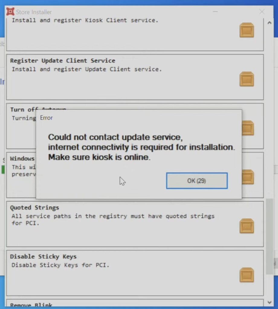 The error message reads “Could not contact update service, internet connectivity is required for installation. Make sure kiosk is online.”