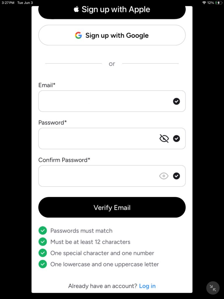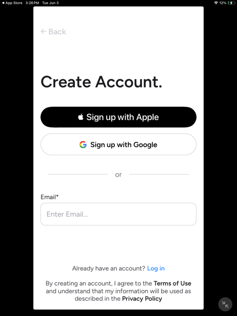 Now you will have an option on how you would like to sign up, you can choose to sign up with Apple or Google or you can opt to use your Email address. If you already have an existing account, located at the very bottom, you’ll see a sign in link. I opted to sign up using my email address as opposed to using Apple or Google.