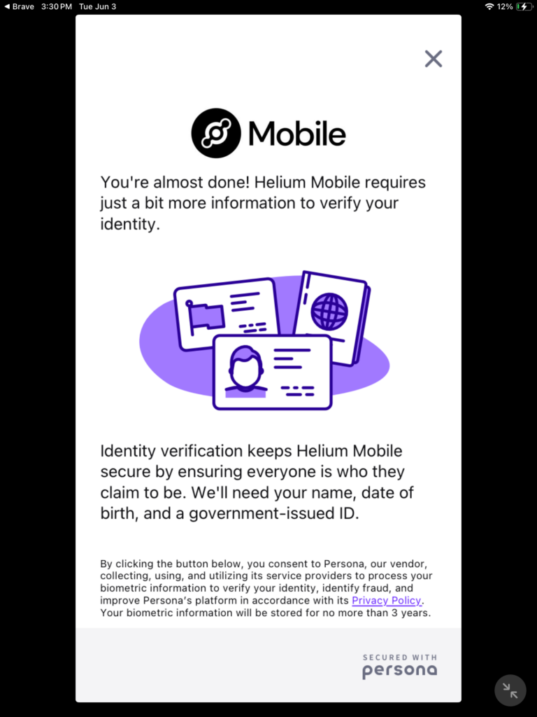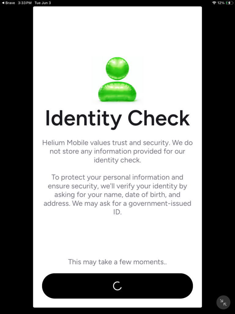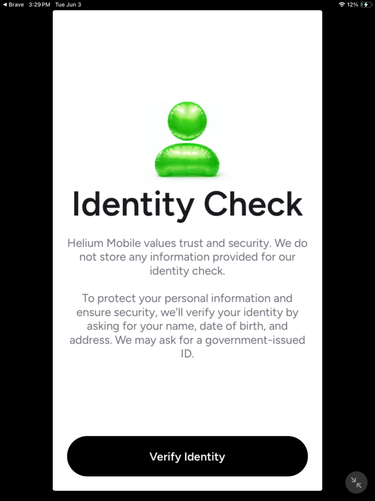 As mentioned earlier that you should have provided truthful and accurate information that matches what is on your government issued ID, in a screenshot below, they say “Helium Mobile values trust and security. We do not store any information provided for our identity check.