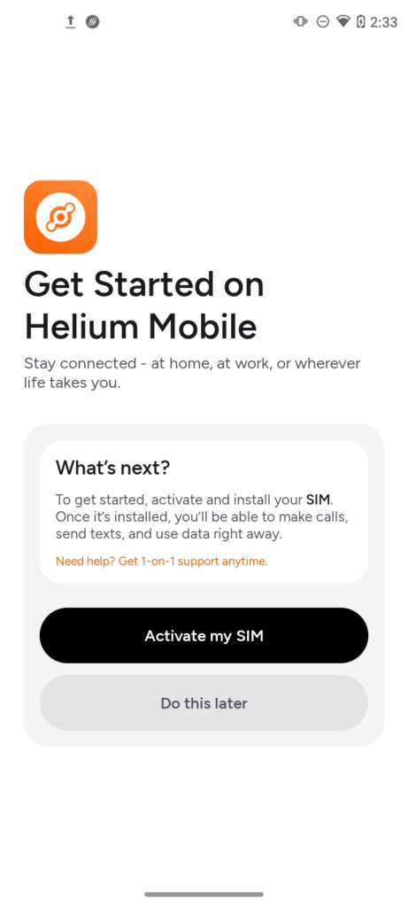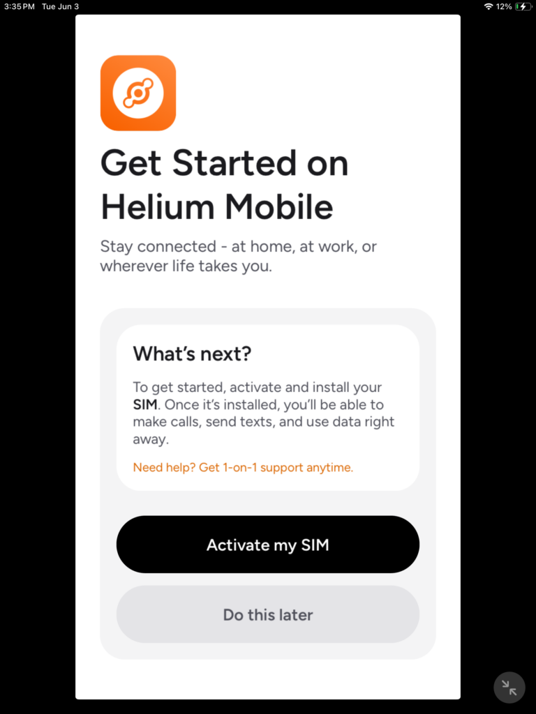 Login into Helium Mobile App with your login credentials if you have logged out, you will the start the SIM card activation process. When you open the app or login you will be taken to this screen, top on “Activate my SIM”.