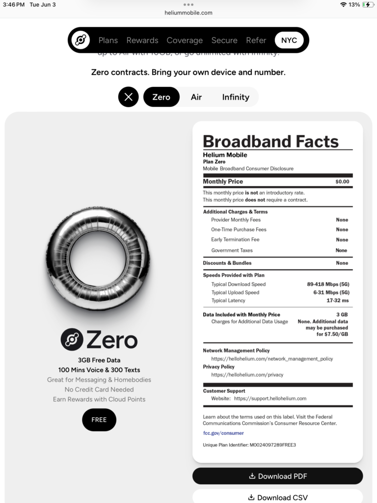 If you’re looking for a free Mobile carrier may want to try Helium Mobile as they say the service is free. To get started head on over to https://heliummobile.com, then tap on “Plans” from the navigation bar, then you should see a button that says “see our plans”. Now you should see three different plans, which is zero, air, and infinity.