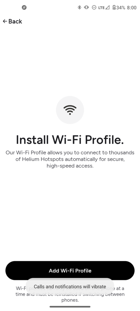 You will be required to install a Wi-Fi profile. You will be able to connect to Helium Mobile hotspots. Tap on “Add Wi-Fi profile”.