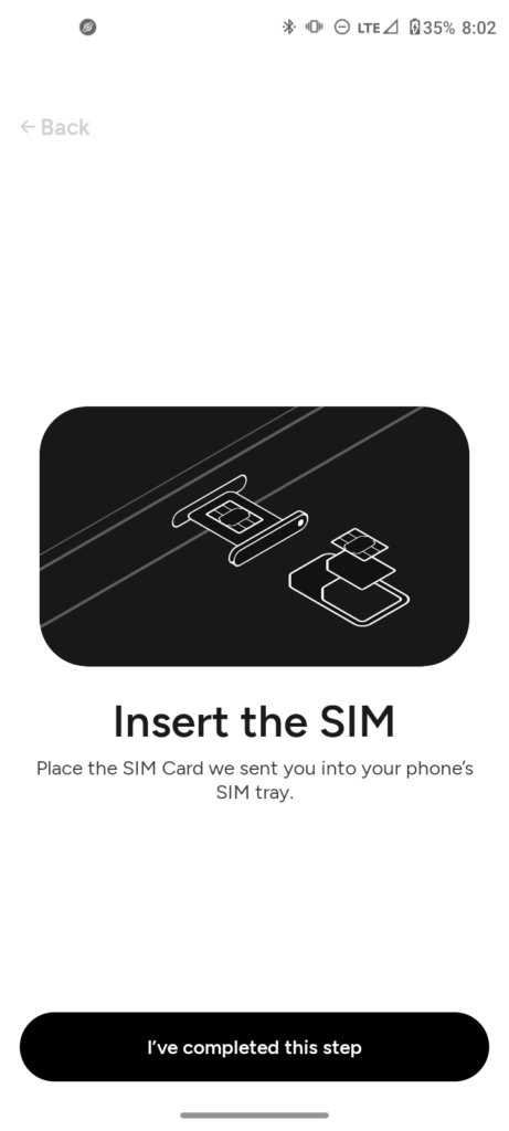 Now we need to activate the Sim card, If you have not inserted your Sim card into your phone, please insert your Sim card into your phone and then tap on “ I’ve completed this step”, If you already have inserted your Sim card, then just tap on “ I’ve completed the step”.