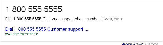Note: A featured snippet can appear like the one on the photo with a domain name or with a name and a phone number.