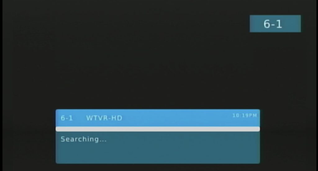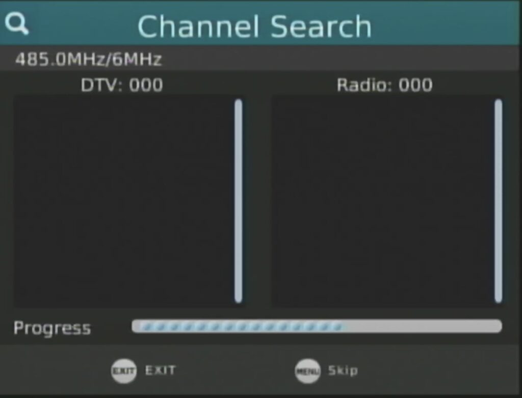 To do a channel search. Make sure that what looks like appears to be a big button is highlighted in blue then press the OK button in the channel search will start as seen in the next photo.
