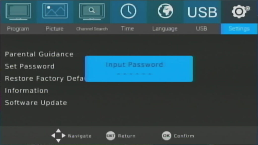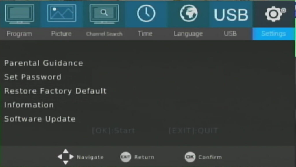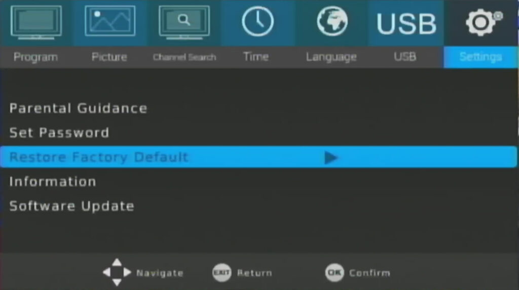 After you press menu on your remote control, you will see a screen that will look like this, scroll all the way until you see “SETTINGS“ then chose “Restore Factory Default”.