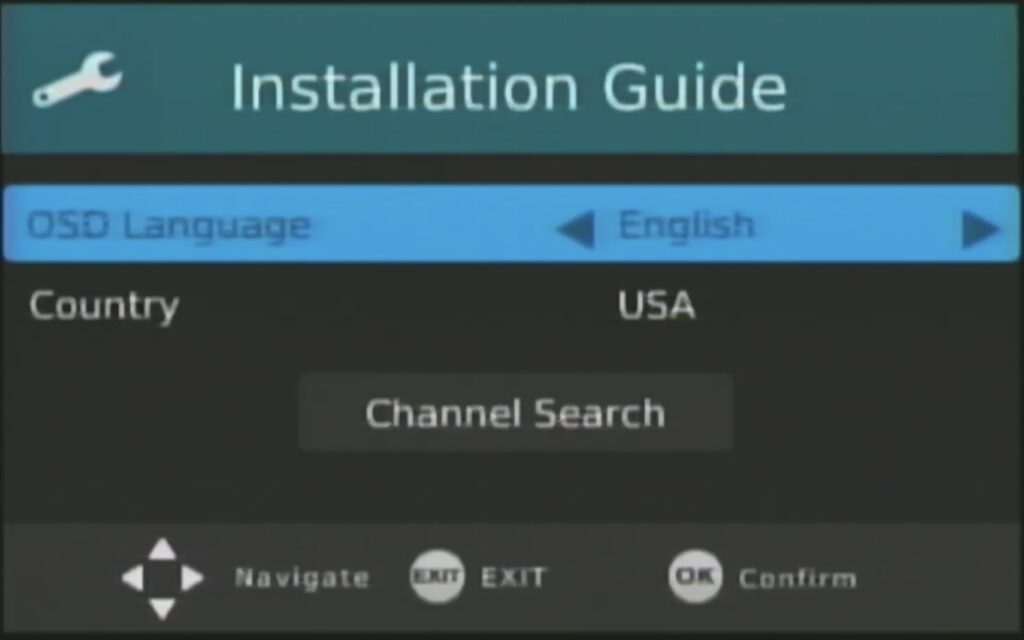 Country: USA (if you do not want to change the default country, which is USA just use the down arrow on your remote to move onto the next setting, if you want to change the default setting from USA use the right or left arrow to select the country then use the down arrow to move onto the next setting.)
