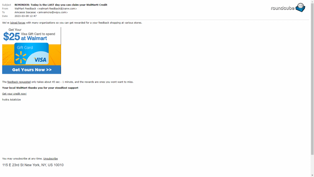Today as I was checking emails I saw this email titled “REMINDER: Today is the LAST day you can claim your WalMartt Credit” witch tells me this is a SCAM when the first hint is the name of the company is spelled wrong. Walmart is not spelled WalMartt.