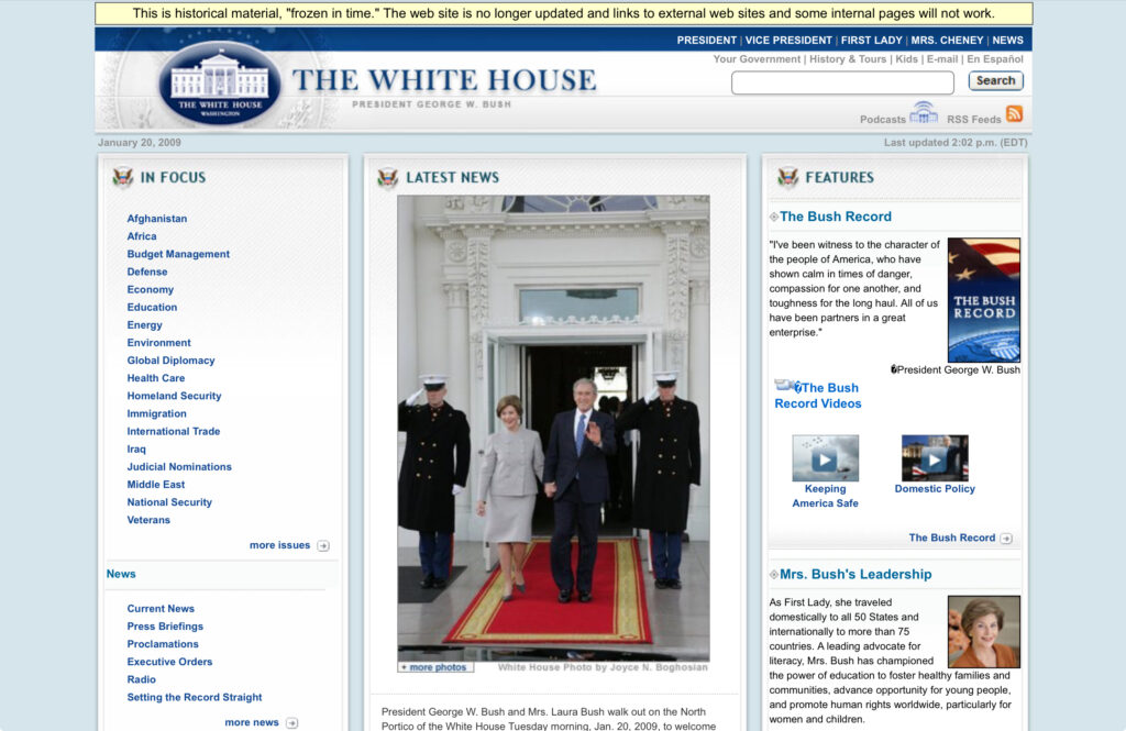 While the Clinton era of the site did offer some videos and audio recordings, the Bush era really embraced this, and they would live stream from their own platform. By the time Bush’s term was up and Obama was going to be the 44th President,.