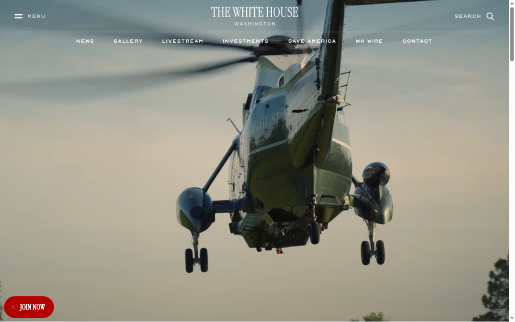 Looking at the current whitehouse.gov website, the site follows more of the same themed layout. However, what is different from the other versions — and from Trump’s first term in office — is the use of a video that plays on a loop, and the navigation bar almost blends into the background to allow the video to play almost unobstructed. When you hover over the navigation bar, it does turn white, and you can then click on the links.